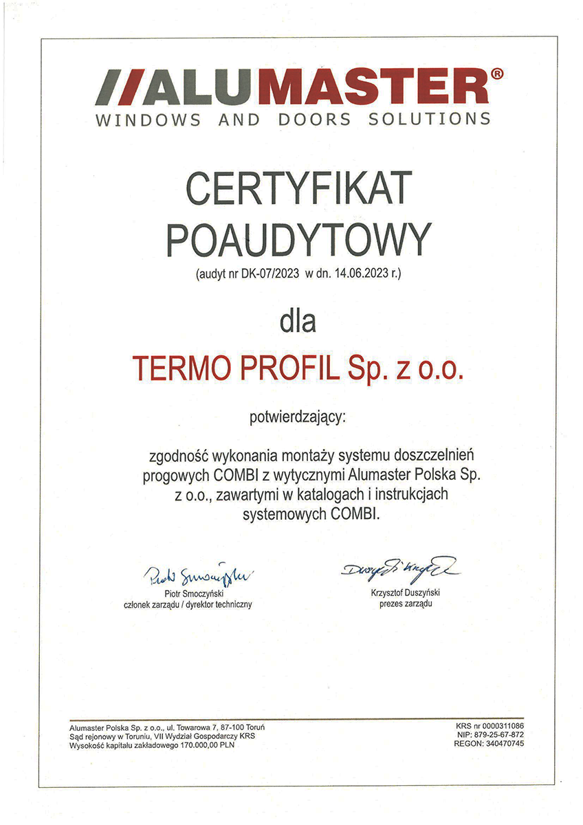Miło nam poinformować, iż dnia 14 czerwca 2023 r. firma Termo Profil otrzymała Certyfikat Poaudytowy od firmy ALUMASTER Polska Sp. z o.o.