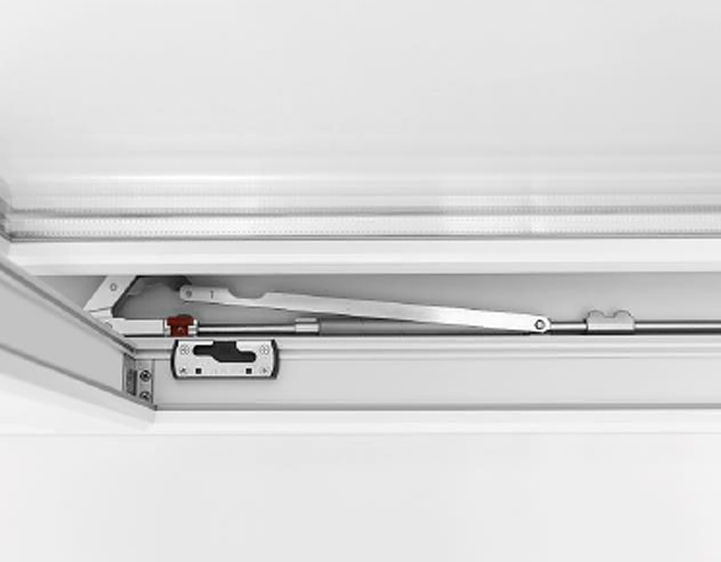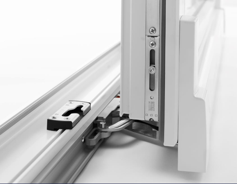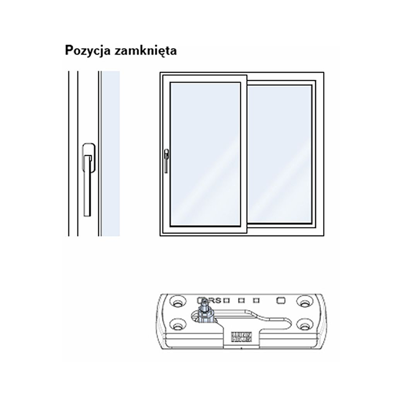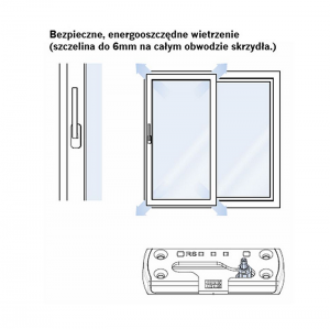Okucie umożliwia 3 funkcje: przesuwania, ryglowania oraz wietrzenia przy skrzydle równolegle odsuniętym od ramy za pomocą zwykłej klamki okiennej.
