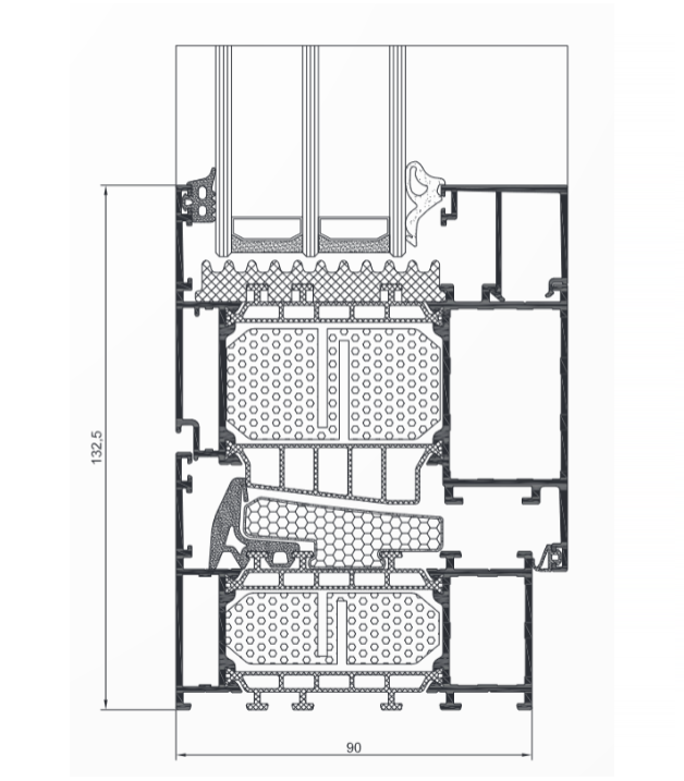 Genesis 90 to trójkomorowy system przeznaczony do konstruowania okien i witryn o bardzo dobrych parametrach termoizolacji. Uzyskano je poprzez zastosowanie komorowej przekładki termicznej o wysokości 55mm, specjalnych wkładów termicznych, wsuwanych pomiędzy przekładki termiczne oraz dookoła szyby.